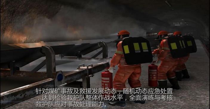 该系统收集了丰富的应急救援知识和实战救援经验,由相关煤炭救援专家、煤炭集团技术总工程师、一线救援队伍作为顾问,编制了一个针对煤矿应急救援的权威培训脚本。该系统主要包括火灾、水灾、冒顶、瓦斯爆炸等培训演练内容。该系统以煤矿应急救援队伍执行救援任务为主线,针对煤矿事故及救援发展动态,对救援队员的随机应急处置能力、专业技术水平、操作规程以及设备操作技能等各个方面进行全方位的考核培训。