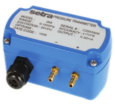 Model 268 或268MR 微差压变送器可用来测量差压或表压( 静态), 并将信号转换为成比例的电流信号,输出4-20mA 的电流信号。激励电压为24VDC。Model 268(EX) 符合本质安全要求,防爆等级为ia ll CT4( 特选), 可在防爆的环境下正常工作。Model268/268MR 最小测量范围为0 ~ 25Pa, 最大测量范围为0 ~ 25KPa, 在室温下精度为±1%FS, 温度补偿范围在+5 ~ +65℃ , 通过温度补偿电路,使温度影响小于±0.06%FS/℃。Model 268/268MR 以其卓越的性能价格比,广泛应用于天然气管道监测,电厂风压检测等领域。